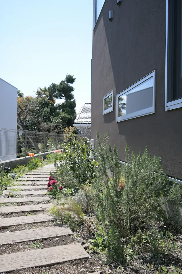 草花で彩られた、お庭に向かうためのアプローチ。 -