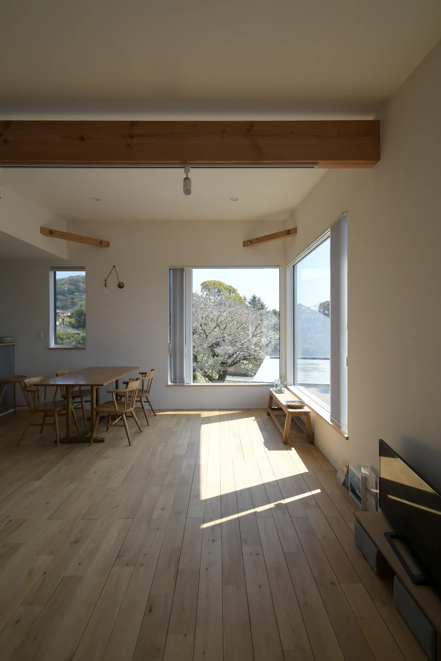 キッチンの向かいに位置するダイニング。各部に設けた窓を介して、穏やかな気候や借景を味わいながら、食事の時間を過ごせる空間に。 -