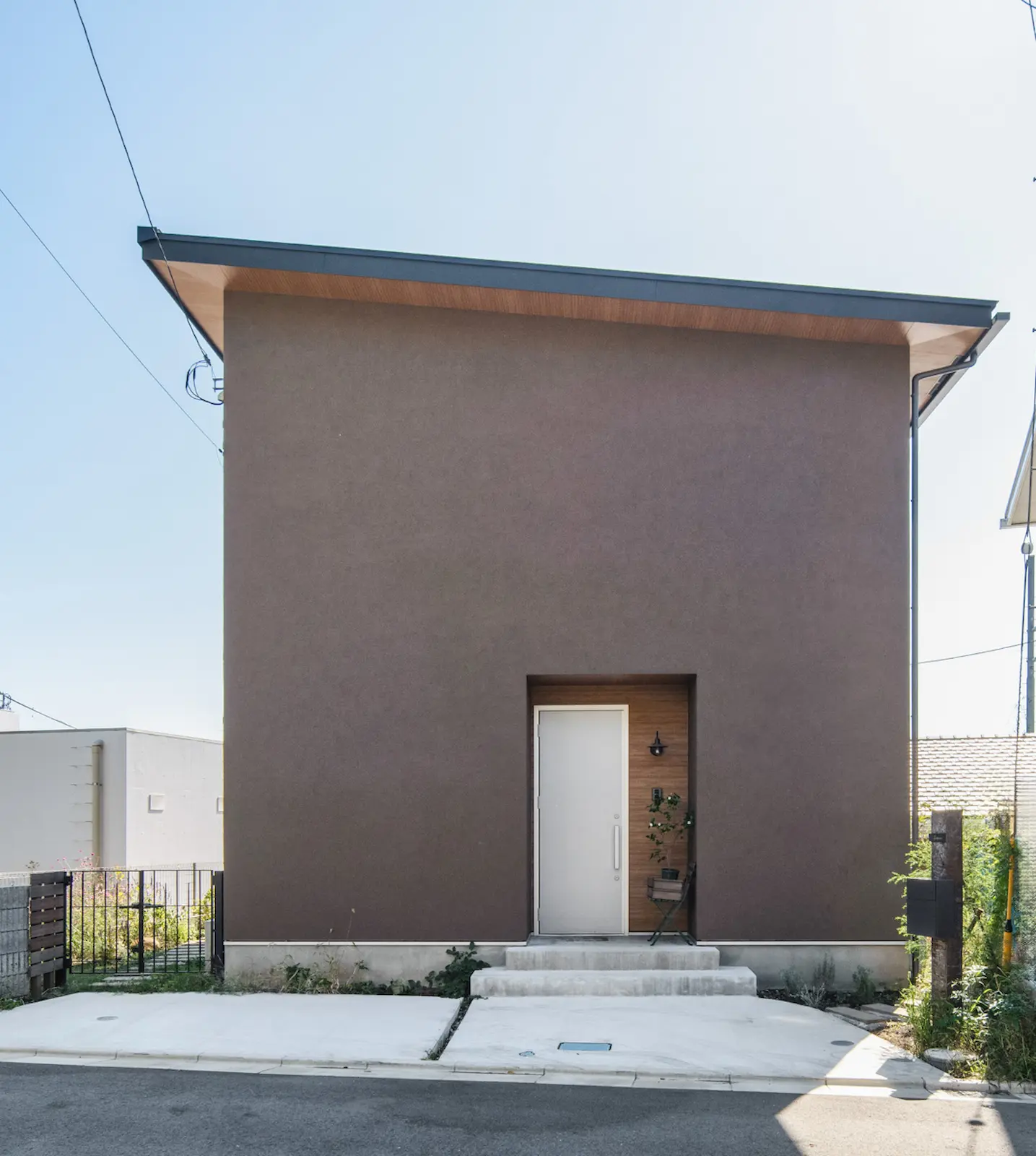 自然豊かな借景を室内空間でも楽しめるように、大開口窓を採用した開放的なリビングとは対照的に、正面の外観はプライベート性を重視したミニマルな佇まいに。 -